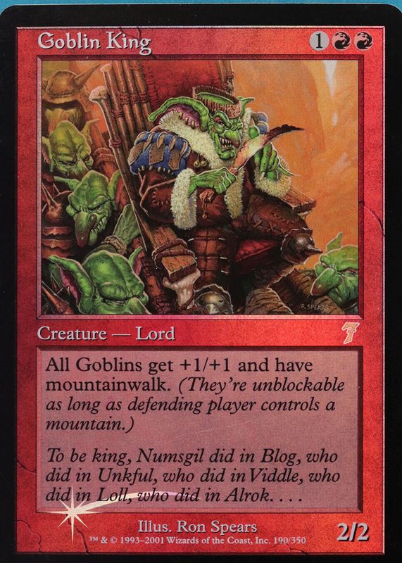 Goblin King's Magic: The Gathering cards are available in at least 3 sets. Goblin King's biggest 7-day price movers are 2001 Seventh Edition #190 Foil, 1995 Fourth Edition Base, and 1999 Sixth Edition #185 Base.
