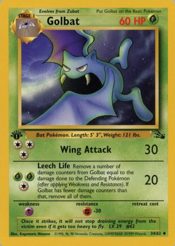 Golbat's Pokemon cards are available in at least 24 sets. Golbat's biggest 7-day price movers are 1999 Fossil #34/62 1st Edition, 2005 EX: Deoxys #031/107 Reverse Holo, and 1997 Japanese Carddass Pocket Monsters #042 Base.