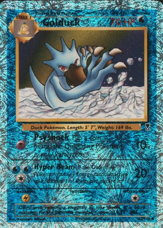 Golduck's Pokemon cards are available in at least 25 sets. Golduck's biggest 7-day price movers are 2023 Scarlet & Violet: 151 #055/165 Reverse Holo, 2002 Legendary Collection #43 Reverse Holo, and 2006 EX: Holon Phantoms #043/110 Reverse Holo.