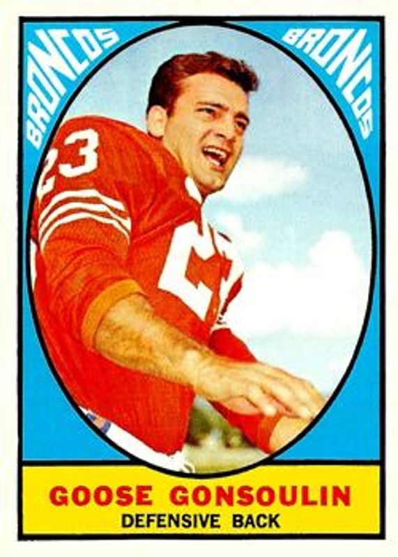 Goose Gonsoulin's Football cards are available in at least 7 sets. Goose Gonsoulin's biggest 7-day price movers are 1967 Topps #34 Base, 1966 Topps #33 Base, and 1965 Topps #52 Base.