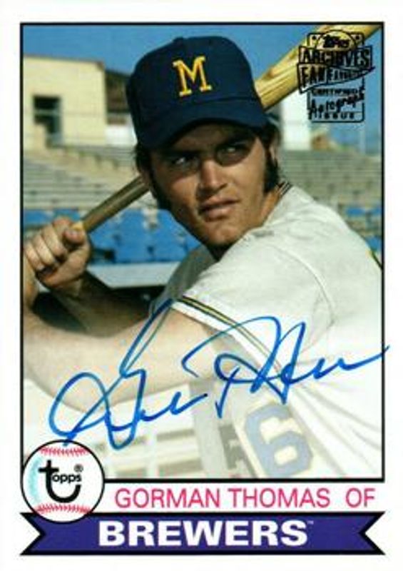 Gorman Thomas' Baseball cards are available in at least 20 sets. Gorman Thomas' biggest 7-day price movers are 2019 Topps Archives #FFA-GT Fan Favorite Autographs, 2019 Topps Archives #FFA-GT Fan Favorite Autographs - Gold /1, and 2019 Topps Archives #FFA-GT Fan Favorite Autographs - Silver /99.