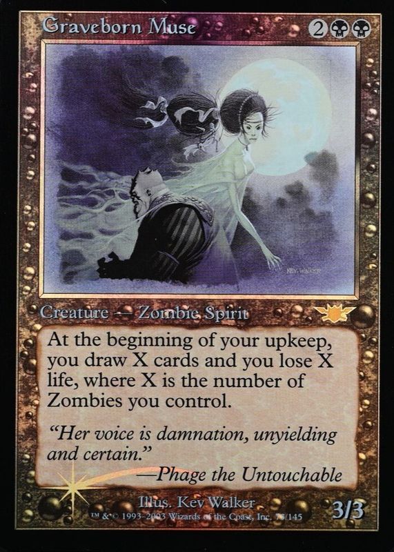 Graveborn Muse's Magic: The Gathering cards are available in at least 1 sets. Graveborn Muse's biggest 7-day price movers are 2003 Legions #73 Base, and 2003 Legions #73 Foil.