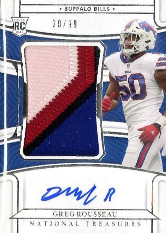 Greg Rousseau's Football cards are available in at least 12 sets. Greg Rousseau's biggest 7-day price movers are 2021 National Treasures #203 Rookie Patch Auto /99, 2024 Totally Certified #37 Totally Certified Signatures - Mirror Platinum Blue Camo /35, and 2024 Totally Certified #37 Totally Certified Signatures - Mirror Platinum Gold /10.