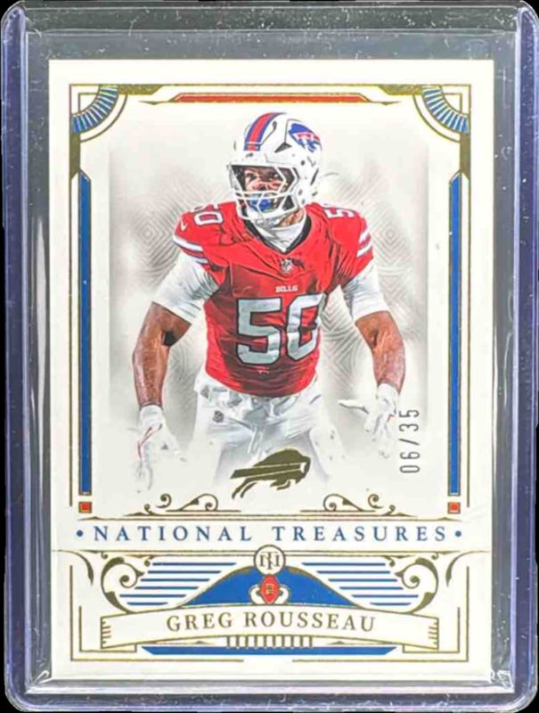 Greg Rousseau's Football cards are available in at least 18 sets. Greg Rousseau's biggest 7-day price movers are 2025 National Treasures #11 Gold /35, 2025 National Treasures #11 Holo Silver /25, and 2025 National Treasures #11 Emerald /10.