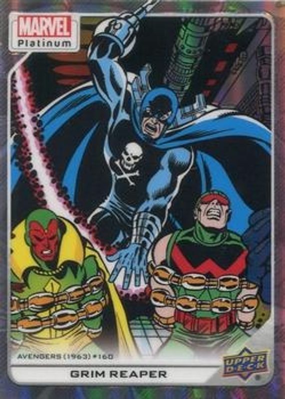 Grim Reaper's Marvel cards are available in at least 6 sets. Grim Reaper's biggest 7-day price movers are 2023 Upper Deck Marvel Platinum #137 Rainbow, 2023 Upper Deck Marvel Platinum #137 Amber Crystals /5, and 2023 Upper Deck Marvel Platinum #137 Printing Plates Black /1.