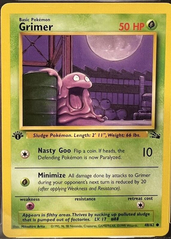 Grimer's Pokemon cards are available in at least 29 sets. Grimer's biggest 7-day price movers are 1999 Fossil #48/62 1st Edition, 2002 Legendary Collection #78 Reverse Holo, and 2006 EX: Legend Maker #54/92 Reverse Holo.