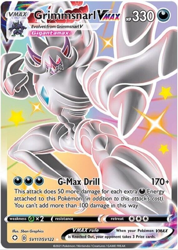 Grimmsnarl VMAX's Pokemon cards are available in at least 2 sets. Grimmsnarl VMAX's biggest 7-day price movers are 2020 Sword & Shield: Darkness Ablaze #115/189 Holo, and 2021 Sword & Shield: Shining Fates #SV117 Shiny Rare (Full Art).