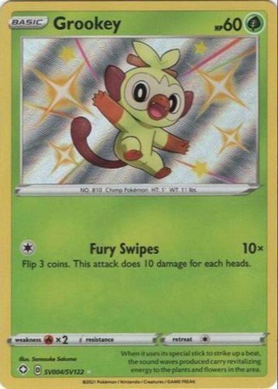 Grookey's Pokemon cards are available in at least 4 sets. Grookey's biggest 7-day price movers are 2020 Sword & Shield: Black Star Promo #SWSH070 Single Pack Blisters (Vivid Voltage), 2021 Sword & Shield: Shining Fates #SV004 Shiny Rare, and 2019 Sword & Shield: Black Star Promo #SWSH001 Galar Collections.