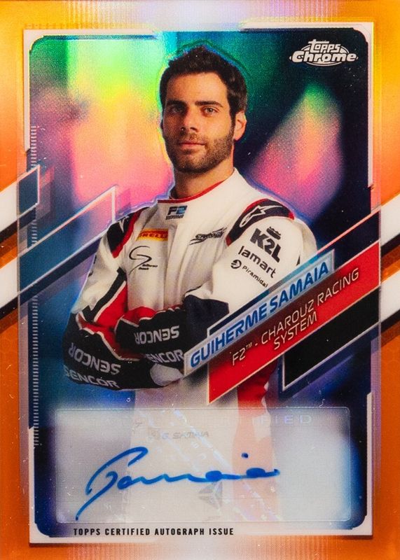 Guilherme Samaia's Racing cards are available in at least 2 sets. Guilherme Samaia's biggest 7-day price movers are 2021 Topps Chrome Formula 1 #CA-GSA Autographs - Orange Refractor /25, 2020 Topps Chrome Formula 1 #F1A-GL Autographs - Gold Wave Refractor /50, and 2021 Topps Chrome Formula 1 #CA-GSA Autographs - Superfractor /1.
