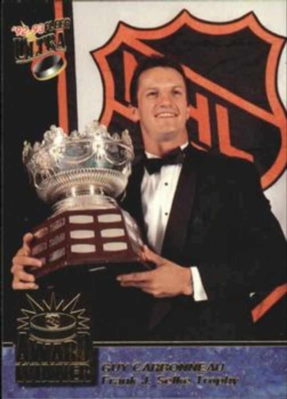 Guy Carbonneau's Hockey cards are available in at least 50 sets. Guy Carbonneau's biggest 7-day price movers are 1992 Fleer Ultra #3 Award Winners, 2002 In The Game Signature Series #39 Autographs Buybacks 1998, and 2002 In The Game Signature Series #39 Autographs Buybacks 1998 - Gold.