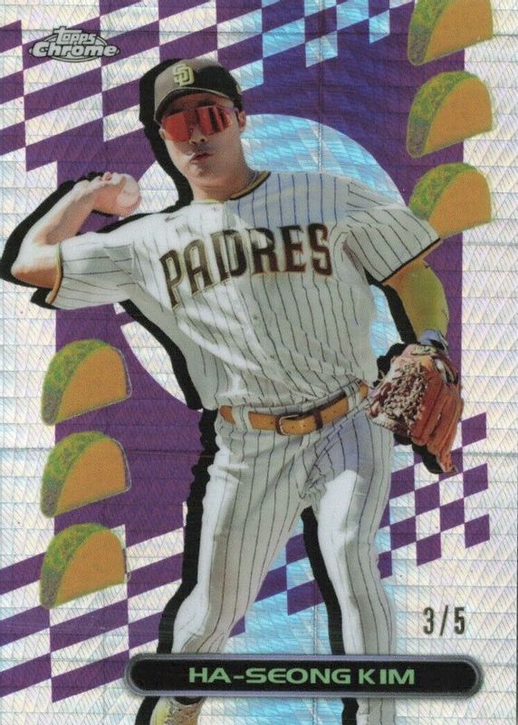 Ha-Seong Kim's Baseball cards are available in at least 33 sets. Ha-Seong Kim's biggest 7-day price movers are 2023 Topps Chrome #TF-136 TacoFractor /5, 2021 Prizm #RA-HK Rookie Autographs - Bronze Donut Circles /15, and 2021 Prizm #178 Purple.