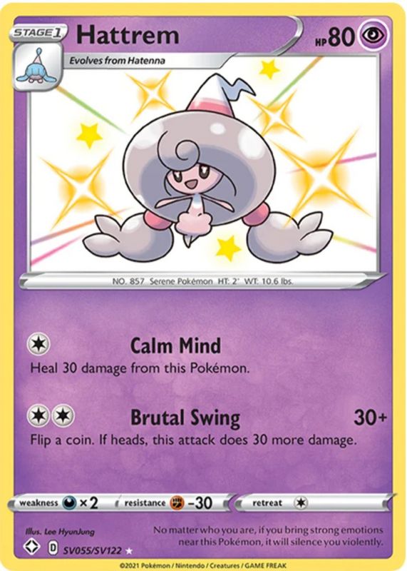 Hattrem's Pokemon cards are available in at least 2 sets. Hattrem's biggest 7-day price movers are 2021 Sword & Shield: Shining Fates #SV055 Shiny Rare, and 2021 Japanese Sword & Shield: Peerless Fighters #31/70 Base.