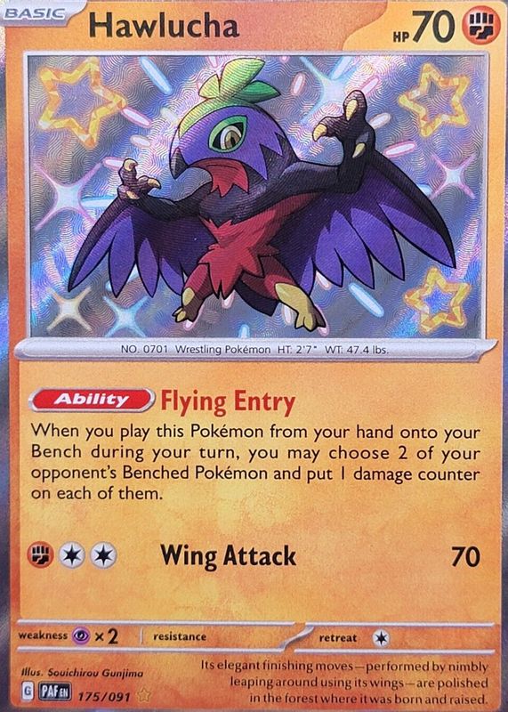 Hawlucha's Pokemon cards are available in at least 14 sets. Hawlucha's biggest 7-day price movers are 2025 Scarlet & Violet: Prismatic Evolutions #089/131 Poke Ball Reverse Holo, 2026 Mega Evolution: Perfect Order #46/88 Reverse Holo, and 2024 Scarlet & Violet: Paldean Fates #175/091 Shiny Rare.
