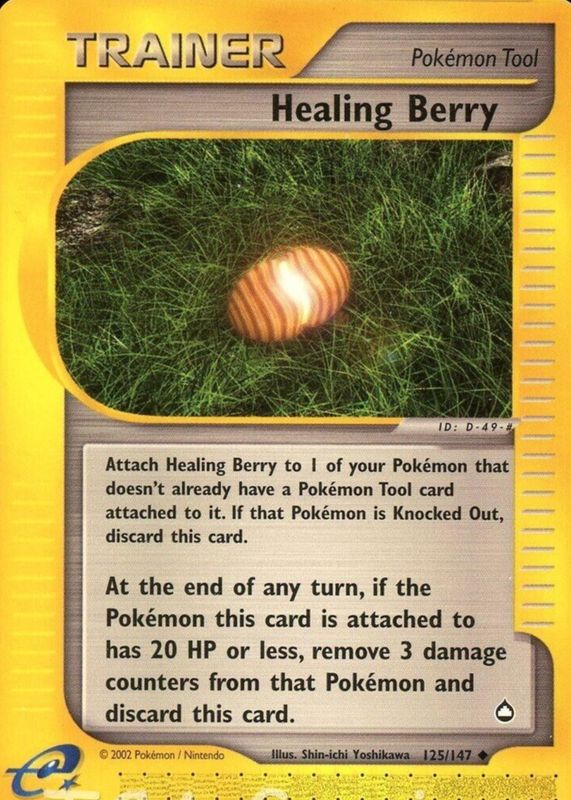 Healing Berry's Pokemon cards are available in at least 2 sets. Healing Berry's biggest 7-day price movers are 2003 Aquapolis #125/147 Base, 2003 Aquapolis #125/147 Reverse Holo, and 2002 Japanese Wind from the Sea #81/87 1st Edition.