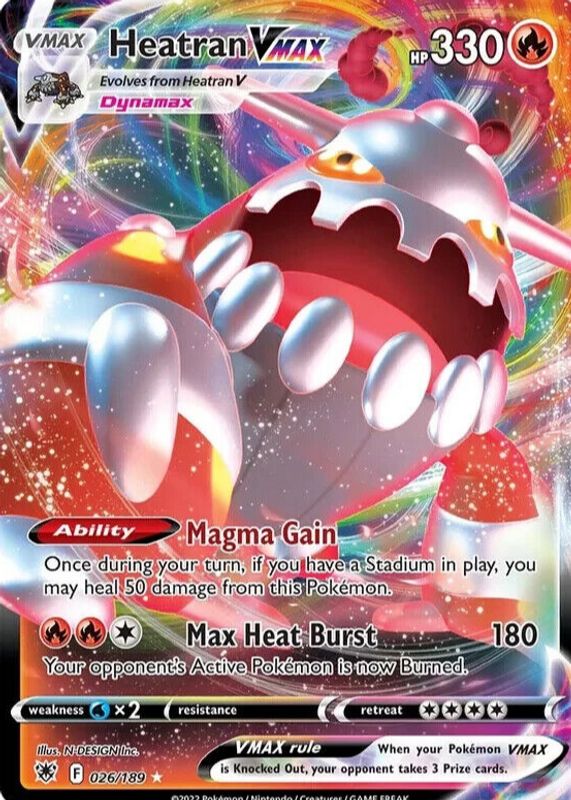 Heatran VMAX's Pokemon cards are available in at least 1 sets. Heatran VMAX's biggest 7-day price movers are 2022 Sword & Shield: Astral Radiance #026/189 Holo.