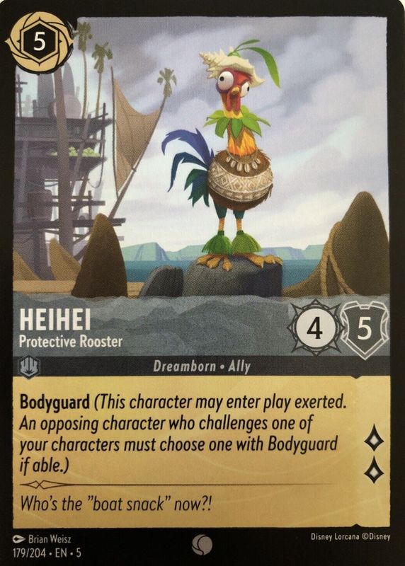 Heihei - Protective Rooster's Disney Lorcana cards are available in at least 1 sets. Heihei - Protective Rooster's biggest 7-day price movers are 2024 Shimmering Skies #179/204 Base, and 2024 Shimmering Skies #179/204 Cold Foil.