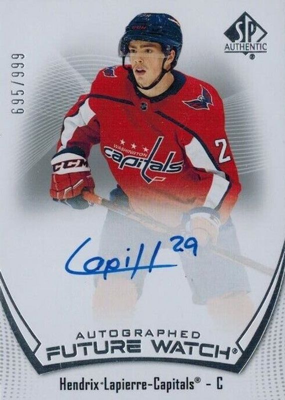 Hendrix Lapierre's Hockey cards are available in at least 25 sets. Hendrix Lapierre's biggest 7-day price movers are 2021 SP Authentic #160 Future Watch Auto /999, 2021 Upper Deck #472 Young Guns - Clear Cut Exclusives, and 2021 Upper Deck #472 Young Guns - Clear Cut.