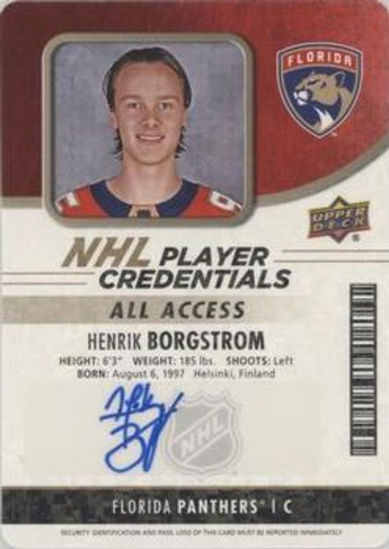 The biggest 30-day change Henrik Borgstrom cards are 2018 Upper Deck MVP #NHL-HB NHL Player Credentials Autographs, 2018 Upper Deck MVP #243 Gold Script /150, and 2018 Upper Deck MVP #243 Silver Script.