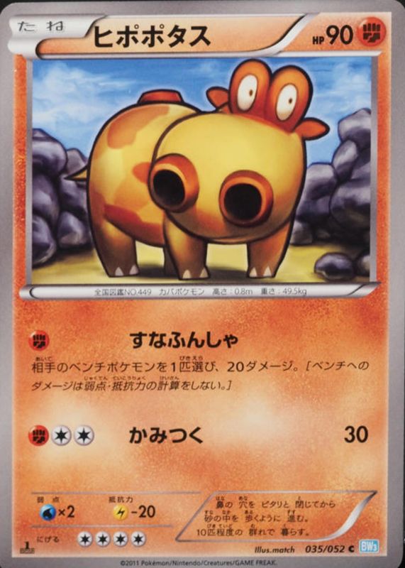 Hippopotas' Pokemon cards are available in at least 15 sets. Hippopotas' biggest 7-day price movers are 2025 Scarlet & Violet: Prismatic Evolutions #052/131 Master Ball Reverse Holo, 2015 XY: Primal Clash #087/160 Base, and 2011 Japanese Black & White: Hail Blizzard #035/052 1st Edition.