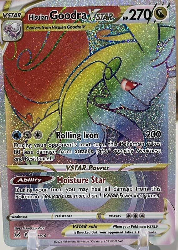 Hisuian Goodra VSTAR's Pokemon cards are available in at least 1 sets. Hisuian Goodra VSTAR's biggest 7-day price movers are 2022 Sword & Shield: Lost Origin #136/196 Holo, and 2022 Sword & Shield: Lost Origin #202/196 Holo (Secret).