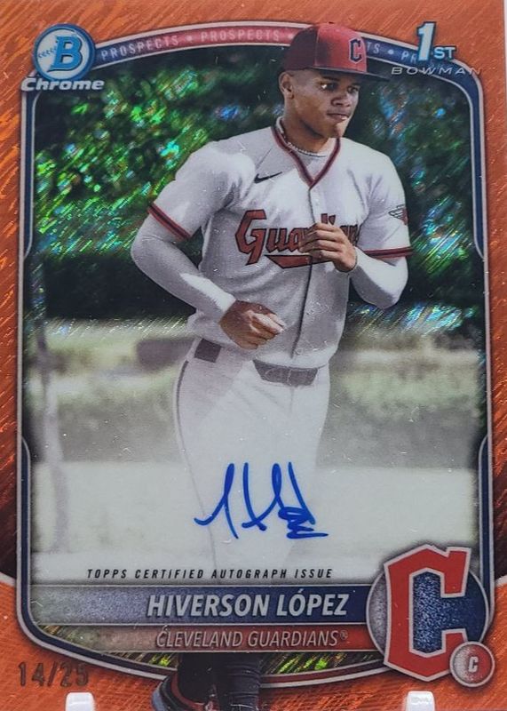 Hiverson Lopez's Baseball cards are available in at least 2 sets. Hiverson Lopez's biggest 7-day price movers are 2025 Bowman Chrome #CPA-HL Prospect Auto (1st), 2025 Bowman Chrome #CPA-HL Prospect Auto - Orange Shimmer Refractor /25 (1st), and 2025 Bowman Chrome #CPA-HL Prospect Auto - Gold Shimmer Refractor /50 (1st).