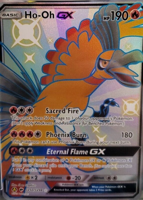 Ho-Oh GX's Pokemon cards are available in at least 5 sets. Ho-Oh GX's biggest 7-day price movers are 2017 Sun & Moon: Burning Shadows #021/147 Holo, 2019 Sun & Moon: Hidden Fates #SV50/SV94 Shiny Rare (Full Art), and 2017 Sun & Moon: Black Star Promo #SM57 Mysterious Power Tins.