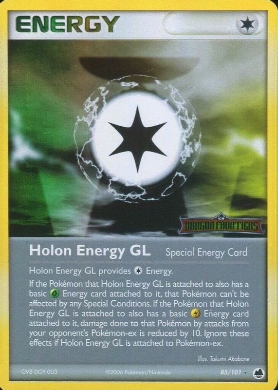Holon Energy GL's Pokemon cards are available in at least 3 sets. Holon Energy GL's biggest 7-day price movers are 2006 EX: Dragon Frontiers #085/101 Reverse Holo, 2005 Japanese EX: Holon Research Tower #084/086 1st Edition, and 2005 EX: Delta Species #105/113 Reverse Holo.