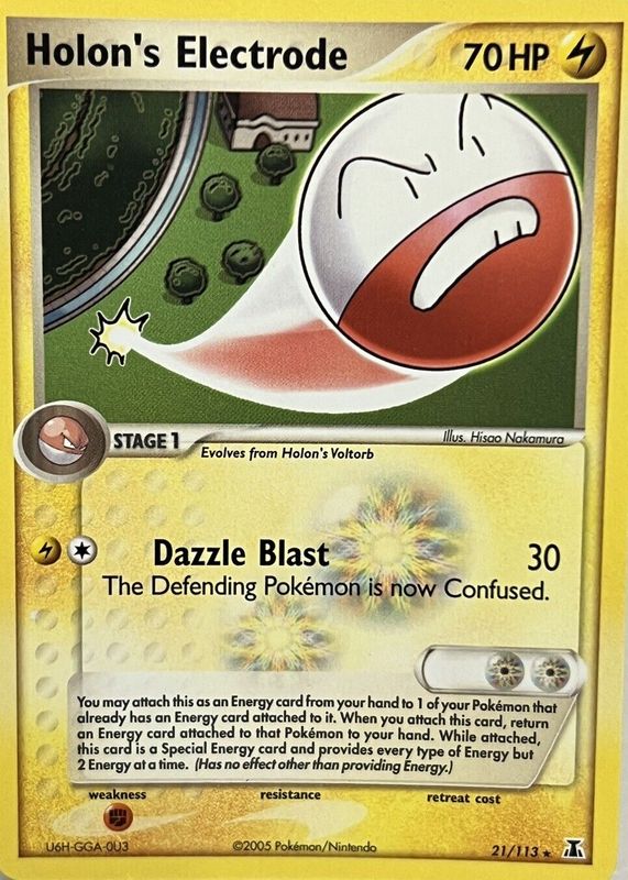 Holon's Electrode's Pokemon cards are available in at least 2 sets. Holon's Electrode's biggest 7-day price movers are 2005 EX: Delta Species #021/113 Base, 2005 EX: Delta Species #021/113 Reverse Holo, and 2005 Japanese EX: Holon Research Tower #032/086 1st Edition Holo.