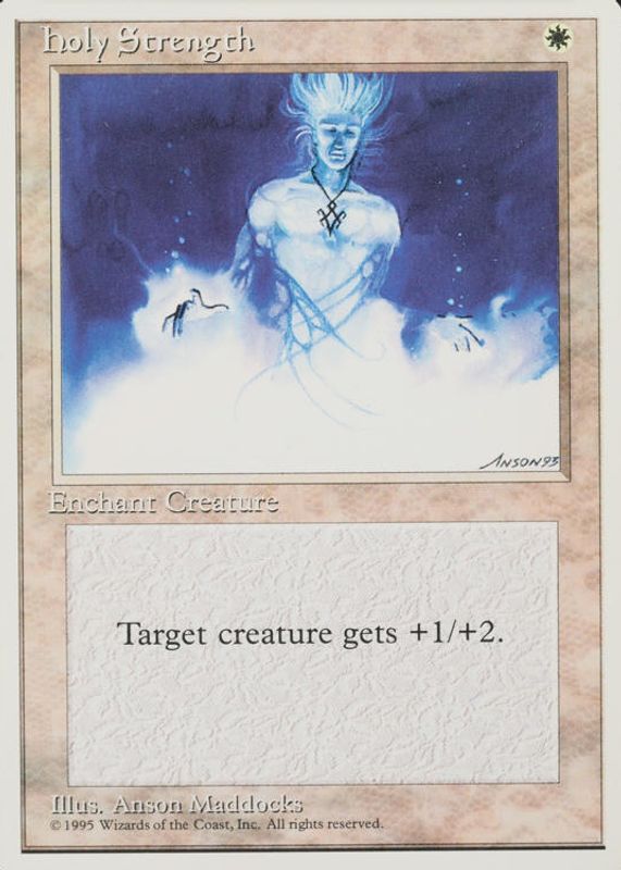 Holy Strength's Magic: The Gathering cards are available in at least 4 sets. Holy Strength's biggest 7-day price movers are 1995 Fourth Edition Base, 1993 Unlimited Edition Base, and 1993 Beta Edition Base.