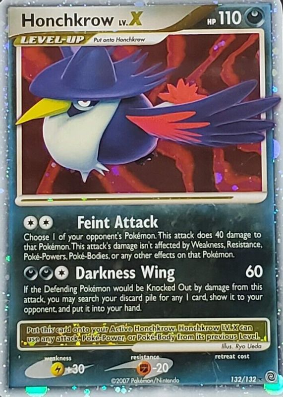 Honchkrow LV.X's Pokemon cards are available in at least 2 sets. Honchkrow LV.X's biggest 7-day price movers are 2007 Diamond & Pearl: Secret Wonders #132/132 Holo, and 2007 Japanese Diamond & Pearl: Moonlit Pursuit 1st Edition Holo.