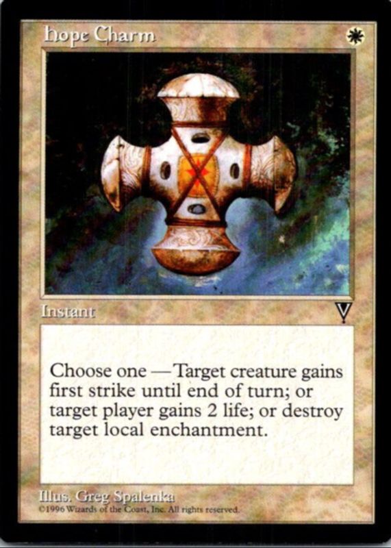 Hope Charm's Magic: The Gathering cards are available in at least 1 sets. Hope Charm's biggest 7-day price movers are 1997 Visions Base.