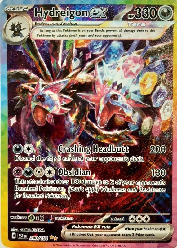 Hydreigon ex's Pokemon cards are available in at least 6 sets. Hydreigon ex's biggest 7-day price movers are 2024 Japanese Scarlet & Violet: Super Electric Breaker #124/106 Super Rare (Full Art), 2024 Scarlet & Violet: Surging Sparks #119/191 Double Rare, and 2024 Scarlet & Violet: Surging Sparks #223/191 Ultra Rare (Full Art).