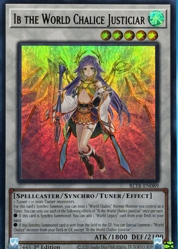 Ib the World Chalice Justiciar's Yu-Gi-Oh! cards are available in at least 1 sets. Ib the World Chalice Justiciar's biggest 7-day price movers are 2024 Battles of Legend: Terminal Revenge #BLTR-EN089 1st Edition Ultra Rare, and 2024 Battles of Legend: Terminal Revenge #BLTR-EN089 1st Edition Quarter Century Secret Rare.
