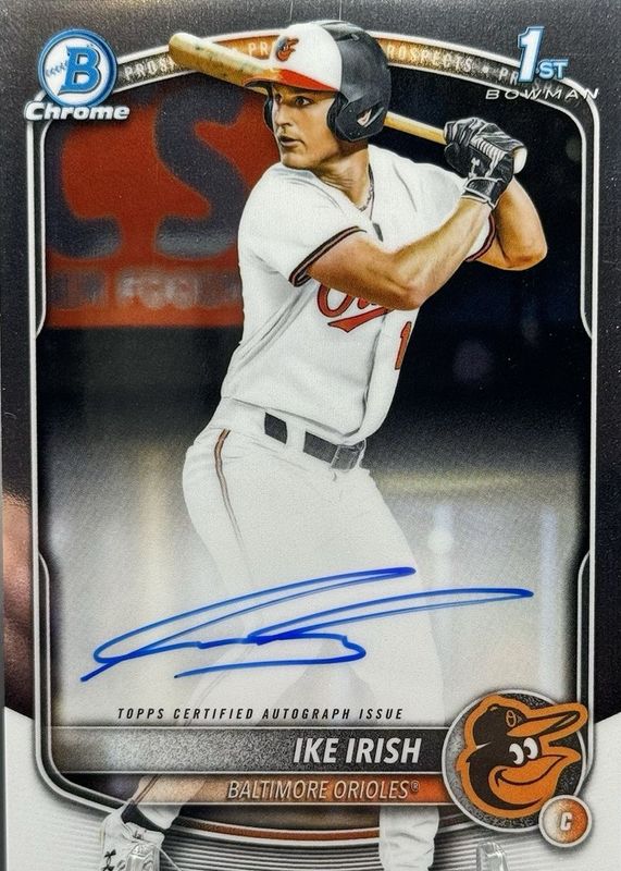 Ike Irish's Baseball cards are available in at least 5 sets. Ike Irish's biggest 7-day price movers are 2025 Bowman Draft #BDC-16 Chrome - Purple Geometric Refractor /250 (1st), 2025 Bowman Draft #BD-16 Base (1st), and 2025 Bowman Draft #CPA-II Chrome Prospect Auto - Purple Refractor /250 (1st).