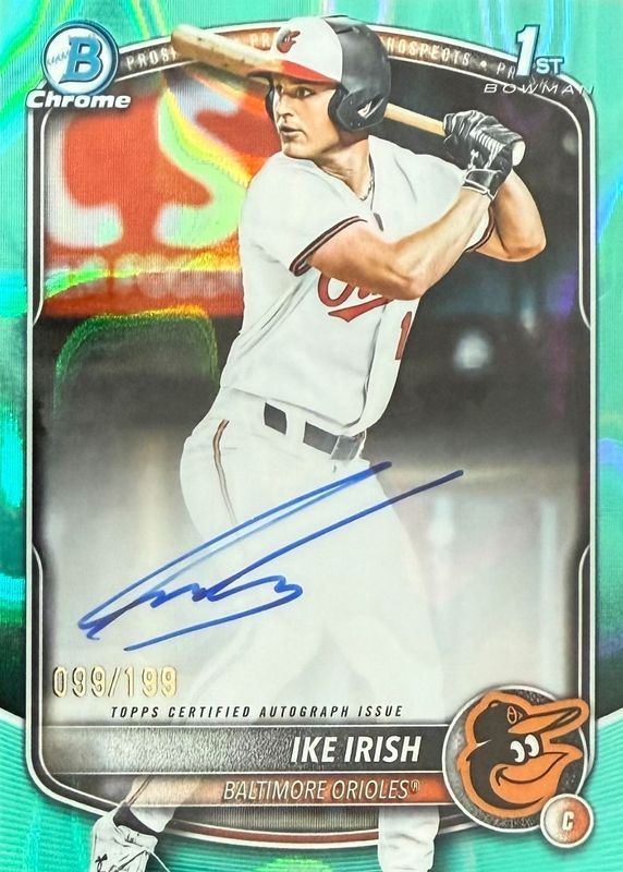 The biggest 30-day change Ike Irish cards are 2025 Bowman Draft #BDC-16 Chrome - Sky Blue Refractor (1st), 2025 Bowman Draft #BDC-16 Chrome - Yellow Reptilian Refractor /75 (1st), and 2025 Bowman Draft #BD-16 Gold Border /50 (1st).