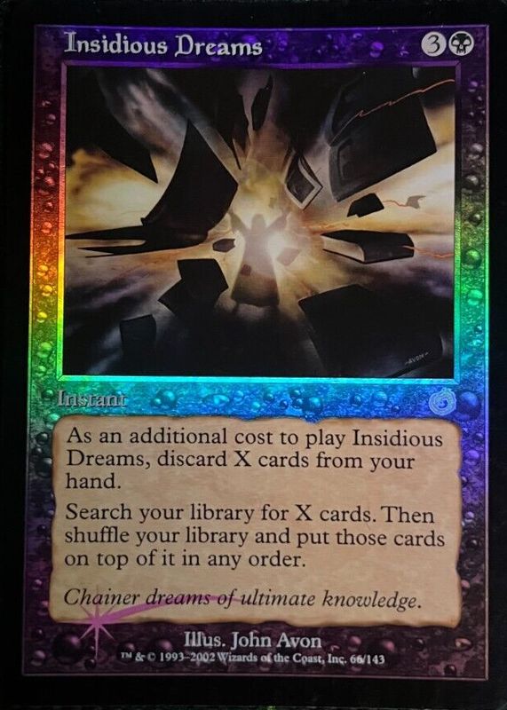 Insidious Dreams' Magic: The Gathering cards are available in at least 1 sets. Insidious Dreams' biggest 7-day price movers are 2002 Torment #66 Foil, and 2002 Torment #66 Base.