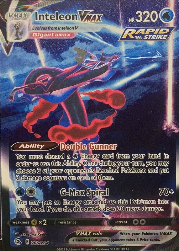 Inteleon VMAX's Pokemon cards are available in at least 2 sets. Inteleon VMAX's biggest 7-day price movers are 2020 Sword & Shield: Rebel Clash #195/192 Holo (Secret), 2021 Sword & Shield: Fusion Strike #266/264 Holo (Alternate Art Secret), and 2020 Sword & Shield: Rebel Clash #050/192 Holo.