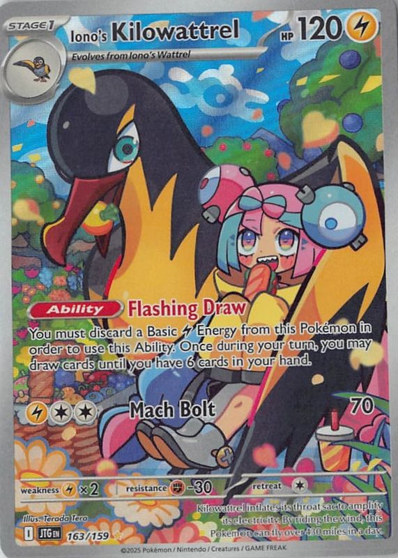 Iono's Kilowattrel's Pokemon cards are available in at least 4 sets. Iono's Kilowattrel's biggest 7-day price movers are 2025 Scarlet & Violet: Journey Together #055/159 Reverse Holo, 2025 Scarlet & Violet: Journey Together #163/159 Illustration Rare, and 2025 Japanese Scarlet & Violet: Battle Partners #032/100 Holo.
