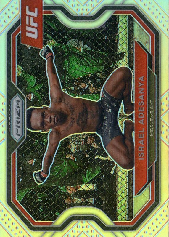 Israel Adesanya's MMA cards are available in at least 24 sets. Israel Adesanya's biggest 7-day price movers are 2021 Prizm UFC #120 Silver, 2024 Topps UFC Royalty #UHA-IA UFC Honors Autographs /25, and 2024 Topps UFC Royalty #97 Platinum /1.