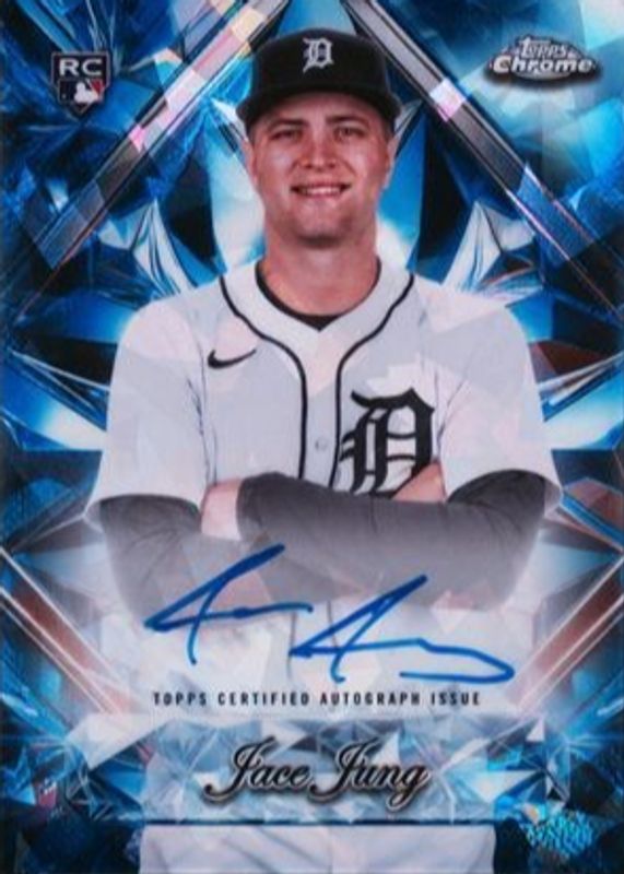 Jace Jung's Baseball cards are available in at least 44 sets. Jace Jung's biggest 7-day price movers are 2025 Topps Chrome #225 Purple RayWave Refractor /250, 2025 Topps Chrome #225 Negative Refractor, and 2025 Topps Chrome Update Sapphire Edition #USC121 Rookie Debut - Gold /50.