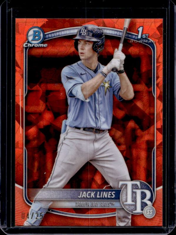 Jack Lines' Baseball cards are available in at least 2 sets. Jack Lines' biggest 7-day price movers are 2025 Bowman #CPA-JLI Chrome Prospect Auto - Refractor /499 (1st), 2025 Bowman #CPA-JLI Chrome Prospect Auto - Purple Refractor /250 (1st), and 2025 Bowman Sapphire Edition #BCP-64 Chrome Prospects - Orange Refractor /25.
