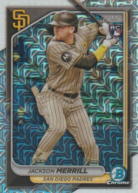 Jackson Merrill's Baseball cards are available in at least 67 sets. Jackson Merrill's biggest 7-day price movers are 2024 Topps Allen & Ginter #275 Base, 2024 Topps Archives #156 Base, and 2024 Topps Update #89US-35 1989 Topps Baseball.