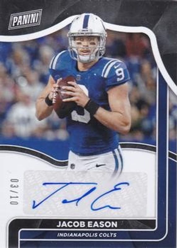 Jacob Eason's Multi-Sport cards are available in at least 5 sets. Jacob Eason's biggest 7-day price movers are 2022 Panini Father's Day #JE Private Signings /10, 2021 Panini Father's Day #JE Private Signings /10, and 2020 Leaf Metal Rookie Autograph #MR-JE1 Base /50.