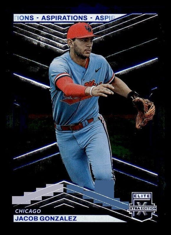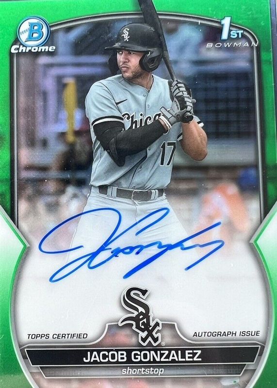 Jacob Gonzalez's Baseball cards are available in at least 15 sets. Jacob Gonzalez's biggest 7-day price movers are 2023 Bowman Draft #CDA-JGO Chrome DP Auto - Green Refractor /99 (1st), 2023 Bowman Draft Sapphire Edition #SS-10 Sapphire Selections, and 2023 Bowman Draft Sapphire Edition #SS-10 Sapphire Selections - Red /5.