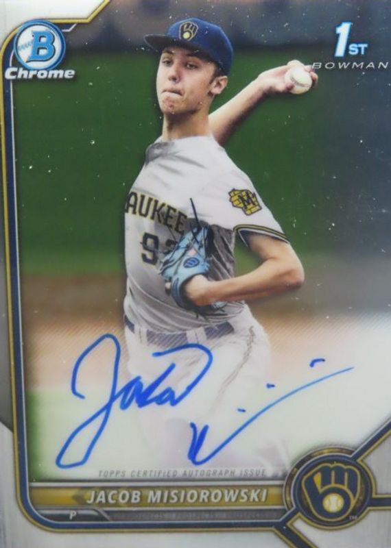 Jacob Misiorowski's Baseball cards are available in at least 12 sets. Jacob Misiorowski's biggest 7-day price movers are 2022 Bowman Draft #CDA-JMI Chrome DP Auto - Black Refractor /75 (1st), 2022 Bowman Draft #CDA-JMI Chrome DP Auto - Refractor /499 (1st), and 2025 Prizm #4 Base Blue Shimmer FOTL /15.