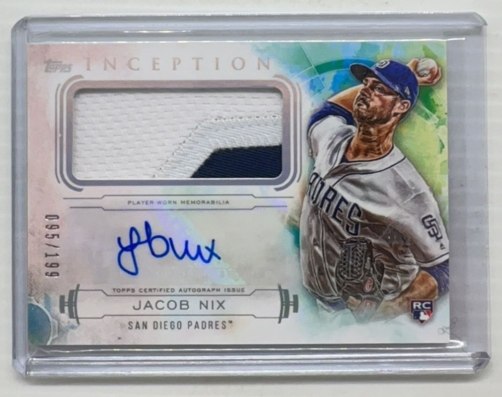 Jacob Nix's Baseball cards are available in at least 5 sets. Jacob Nix's biggest 7-day price movers are 2019 Topps Inception #IAP-JN Autographs Patch /199, 2019 Topps Inception #IAP-JN Autographs Patch - Magenta /75, and 2019 Topps Inception #IAP-JN Autographs Patch Majestic Logo /1.