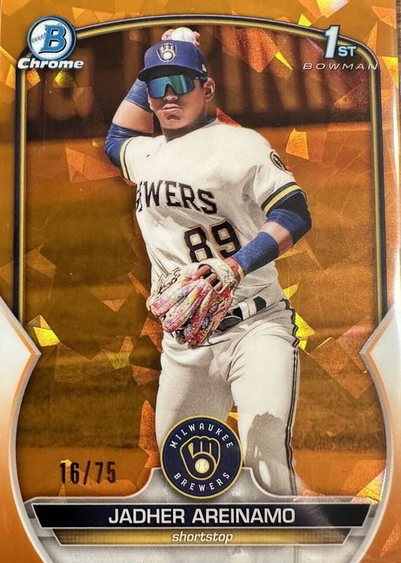 Jadher Areinamo's Baseball cards are available in at least 3 sets. Jadher Areinamo's biggest 7-day price movers are 2023 Bowman Chrome Sapphire Edition #BCP-206 Prospects - Orange /75 (1st), 2024 Bowman #CPA-JA Chrome Prospect Auto - Orange Refractor /25, and 2024 Bowman #CPA-JA Chrome Prospect Auto - Mini-Diamond Refractor /100.