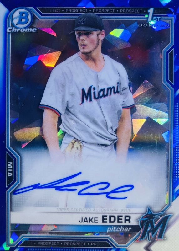 Jake Eder's Baseball cards are available in at least 7 sets. Jake Eder's biggest 7-day price movers are 2021 Bowman Sapphire Edition #BSPA-JE Chrome Prospect Auto (1st), 2025 Topps Heritage #95 Base, and 2025 Topps Heritage #95 Color of the Year /76.