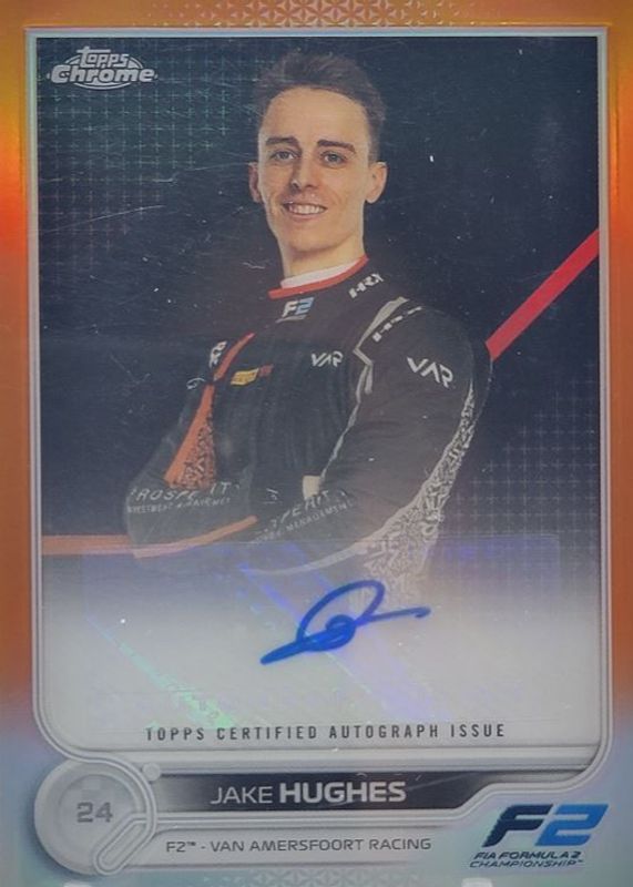 Jake Hughes' Racing cards are available in at least 2 sets. Jake Hughes' biggest 7-day price movers are 2022 Topps Chrome Formula 1 #CAC-JH Autographs - Orange Refractor /25, 2022 Topps Chrome Formula 1 #CAC-JH Autographs - Green Refractor /99, and 2022 Topps Chrome Formula 1 #CAC-JH Autographs - Superfractor /1.