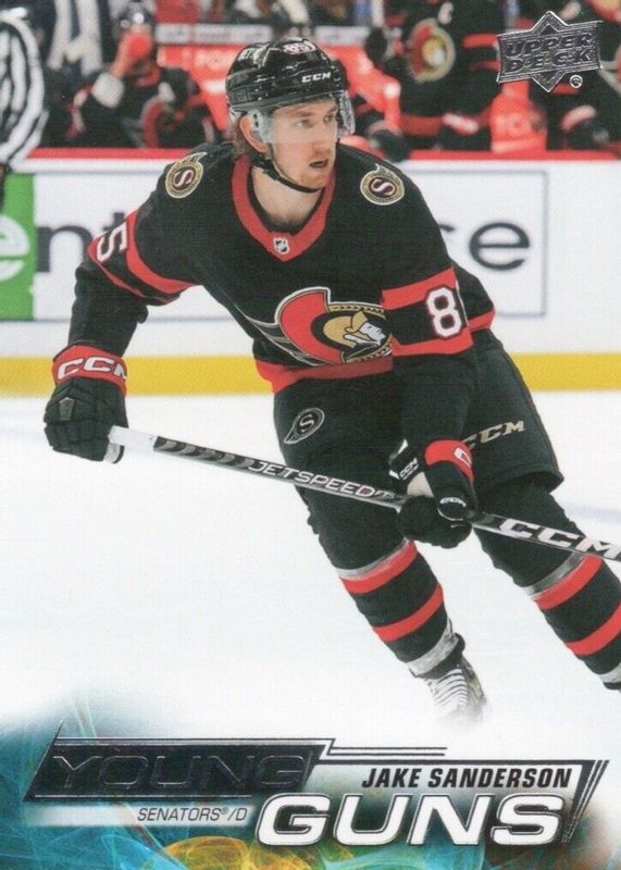 Jake Sanderson's Hockey cards are available in at least 40 sets. Jake Sanderson's biggest 7-day price movers are 2022 Upper Deck #466 Young Guns Base, 2022 Upper Deck The Cup #121 Rookie Patch Auto (/249), and 2022 Upper Deck #466 Young Guns - UD High Gloss /10.